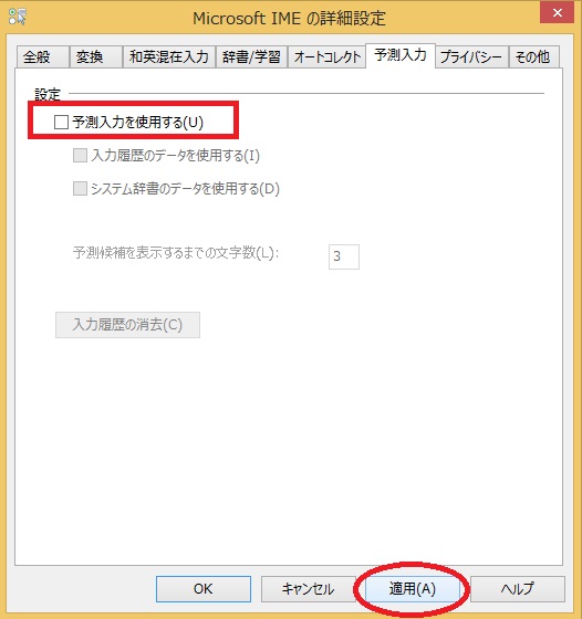 予測入力を使用するのチェックをはずす