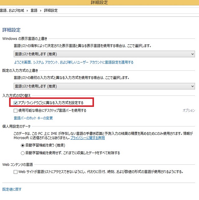 アプリウィンドウごとに異なる入力方法を設定するにチェックを入れる