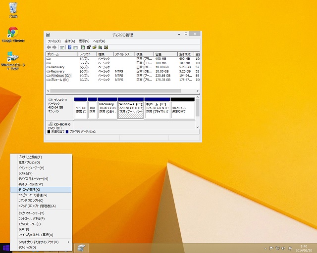 左下のウィンドウボタンを右クリックして、[ディスクの管理]をクリックする